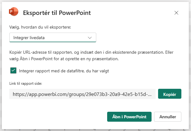 👉 Sådan gør du: Klik på “Eksportér” i den øverste menulinje, og vælg PowerPoint. Vælg herefter muligheden for at inkludere en interaktiv rapport. Du kan også justere, om eksisterende filtre og visninger skal følge med