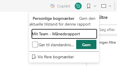 👉 Sådan gør du: Klik på bogmærke ikonet i højre hjørne, og vælg “Tilføj personlig bogmærke”. Giv det et navn, f.eks. “Mit team – månedsrapport”.