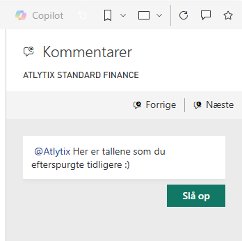 Du kan kommentere både på hele rapporten og på specifikke visualiseringer, og du kan tagge kolleger med @navn, så de får en e-mailnotifikation. Kommentaren bliver gemt sammen med din kontekst, så dine kolleger ser præcis det samme, som du gør.