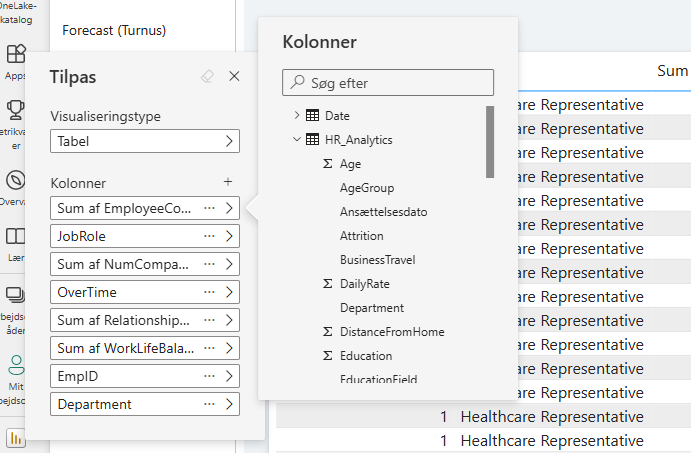 👉 Sådan gør du: Hold musen over en tabel eller matrix, og vælg “Tilpas denne visualisering” i højrehjørne (hvis tilladt). Herfra kan du vælge og fravælge hvilke kolonner, som du gerne vil have i din visualisering, eller justere layoutet.