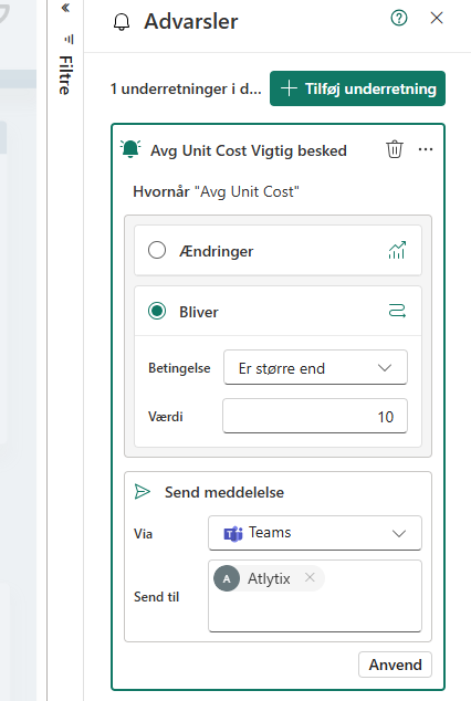 Det er en nem måde at blive gjort opmærksom på ændringer, der kræver handling – uden at du skal åbne rapporten hver dag. Power BI sender dig en mail, når betingelserne er opfyldt, så du eller dit team kan reagere med det samme.